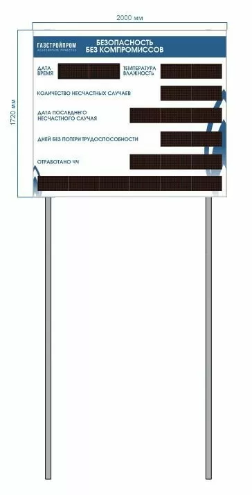 Табло предназначено для отображения количества дней, отработанных без несчастных случаев, аварий, инцидентов, текстовой информации, даты, времени и температуры.