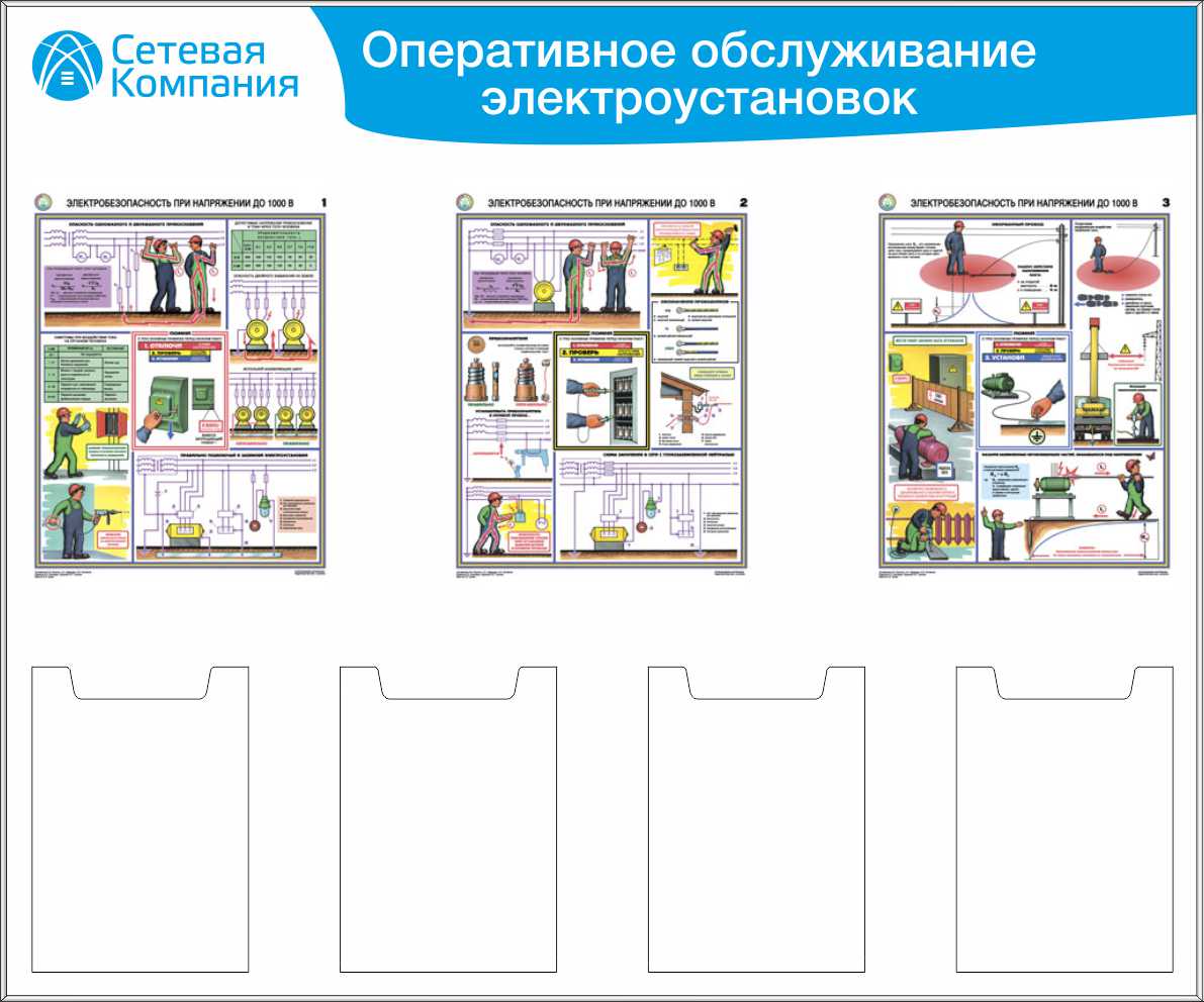 Стенд для ОТ оперативное обслуживание электроустановок, 3 плаката А3, 4 карм. А4 (1 200х1 000; Пластик ПВХ 4 мм, Алюминиевый профиль)