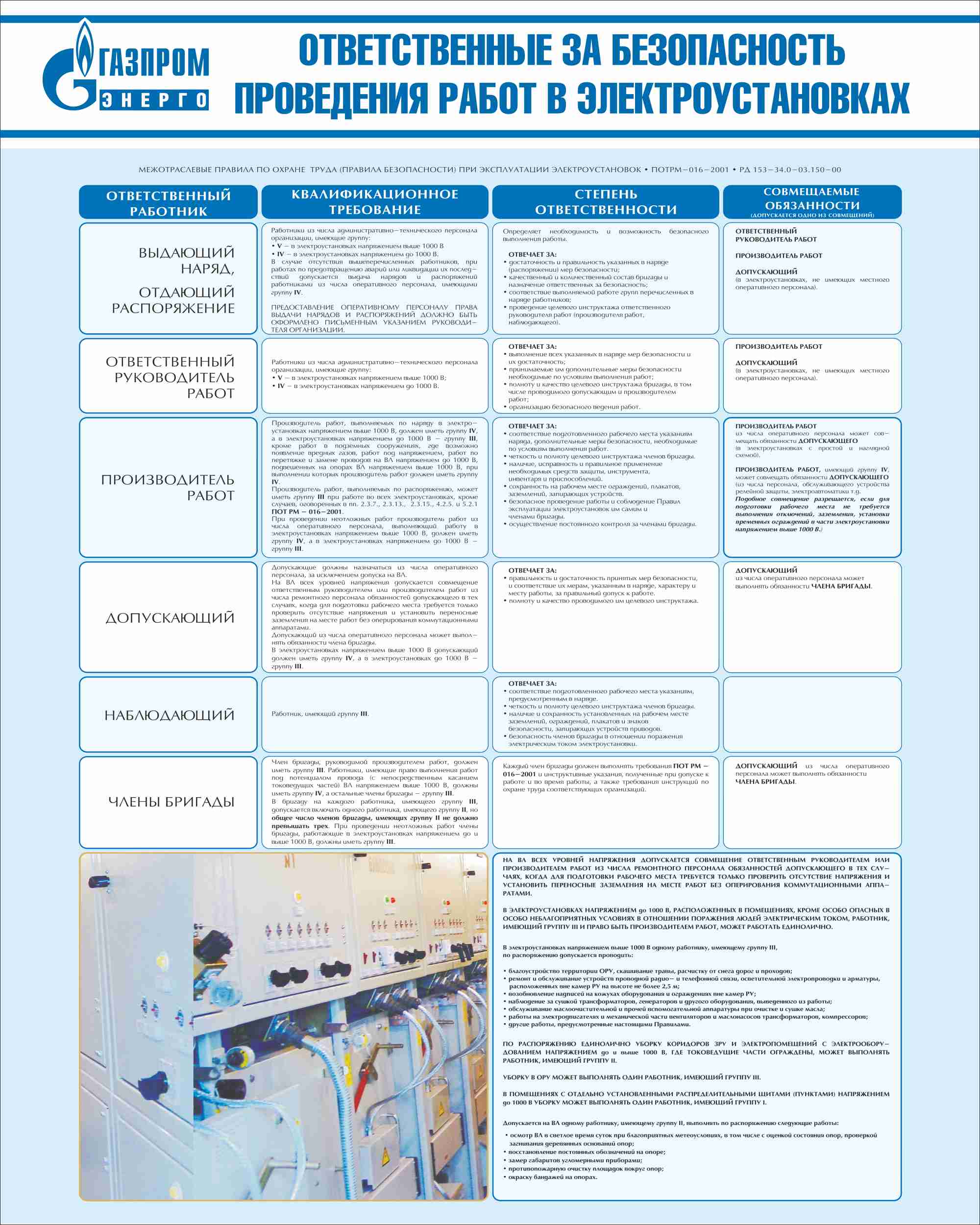 Стенд Ответственные за безопасность проведения работ в электроустановках, плакат, логотип, голубой фон. (800х1 000; Пластик ПВХ 4 мм; Алюминиевый профиль)