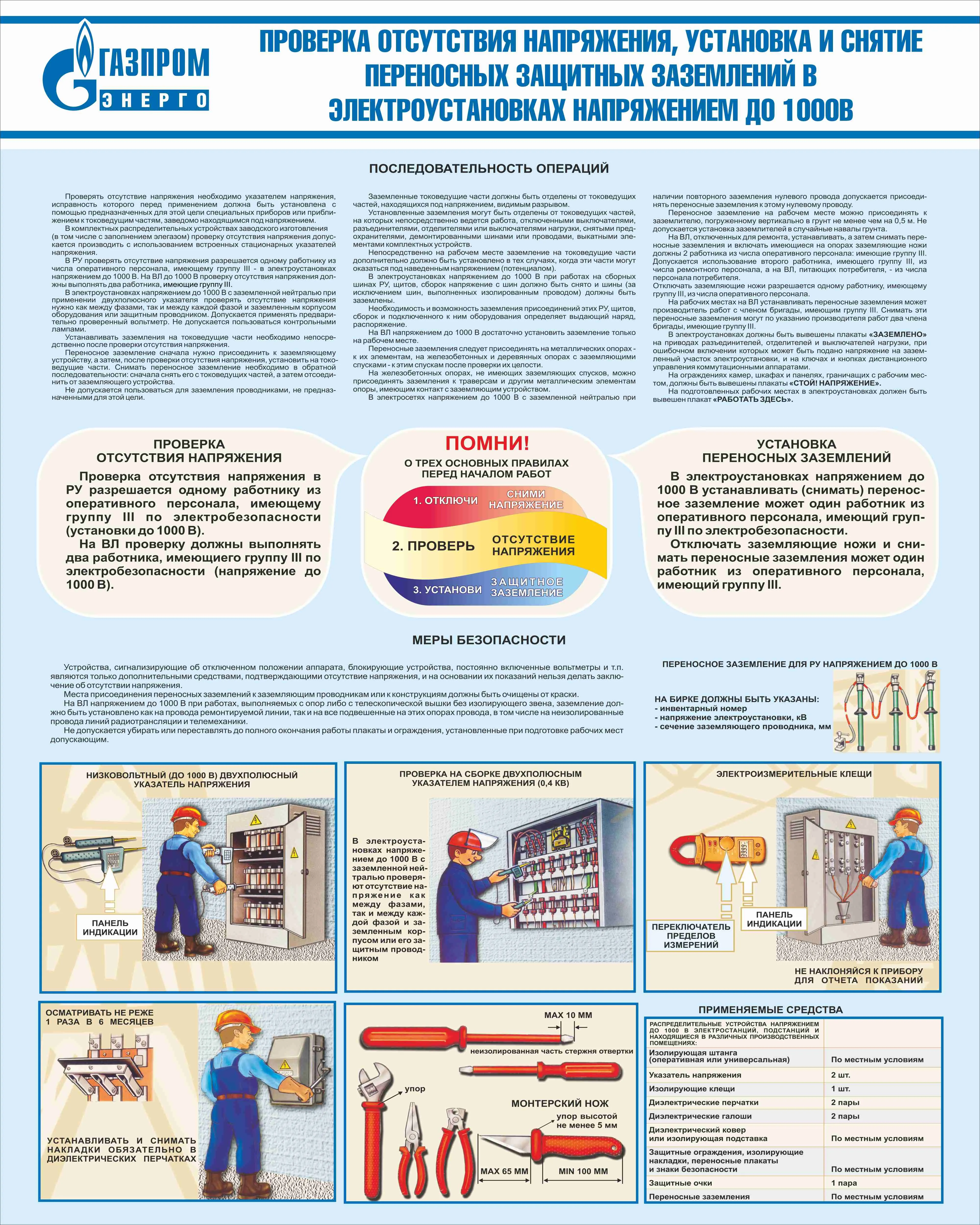 Стенд Проверка отсутствия напряжения, установка и снятие переносных защитных заземлений в электроустановках напряжением до 1000В, плакат, логотип, голубой фон (800х1 000; Пластик ПВХ 4 мм; Алюминиевый профиль)