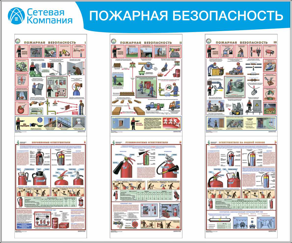 Стенд для ОТ пожарная безопасность, 6 плакатов А3 (1 200х1 000; Пластик ПВХ 4 мм, Алюминиевый профиль)