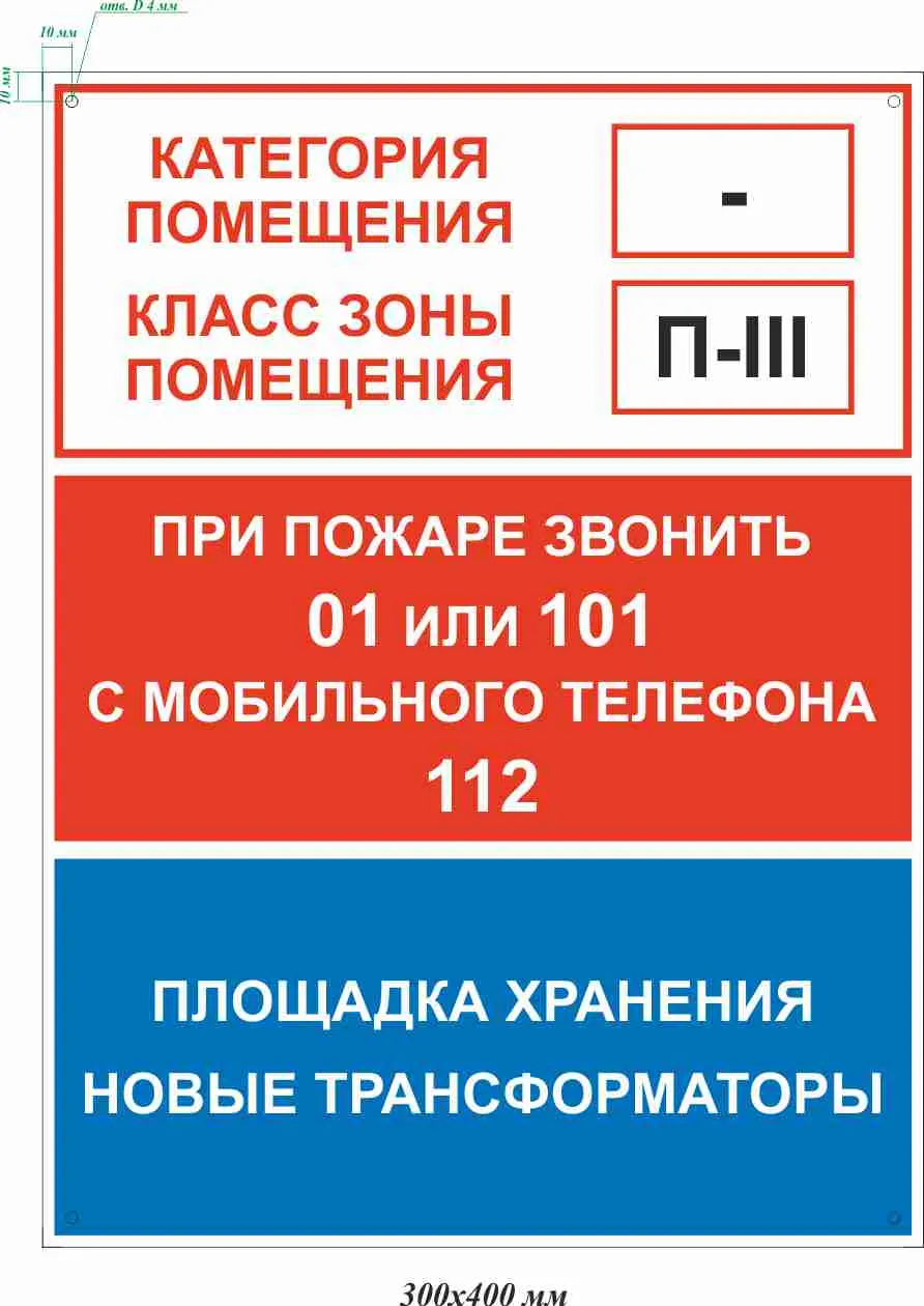 Щит включает структурированные информационные блоки: данные о категории и классе помещения, номера экстренных служб для вызова пожарной охраны (01, 101, 112) и обозначение зоны размещения оборудования — площадки хранения новых трансформаторов. Такое оформление позволяет быстро ориентироваться в аварийной ситуации и снижает риск ошибок.